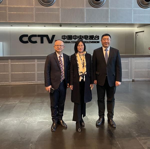 圖為質(zhì)檢協(xié)會(huì)副會(huì)長(zhǎng)王群和會(huì)員協(xié)作發(fā)展中心主任劉輝、企業(yè)工作部主任王劍到訪中央電視臺(tái)