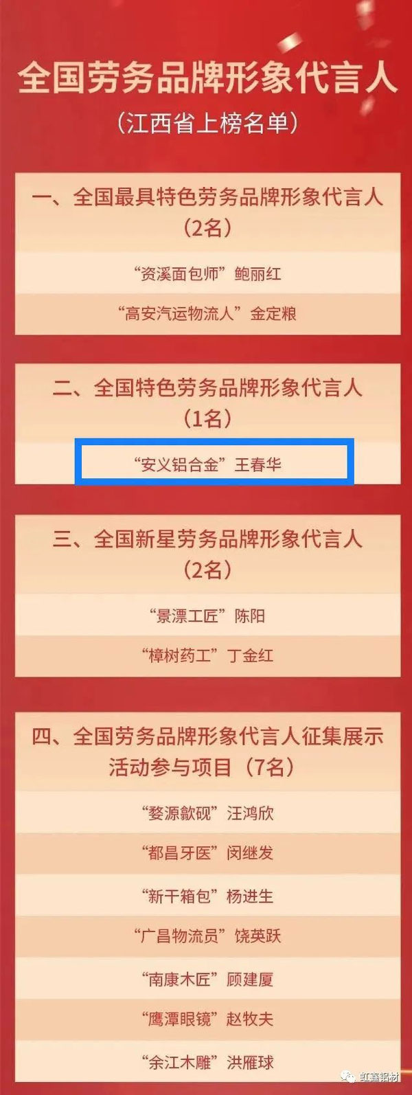 江西省虹鑫鋁業(yè)有限公司董事長王春華榮獲全國勞務品牌安義鋁合金形象代言人稱號