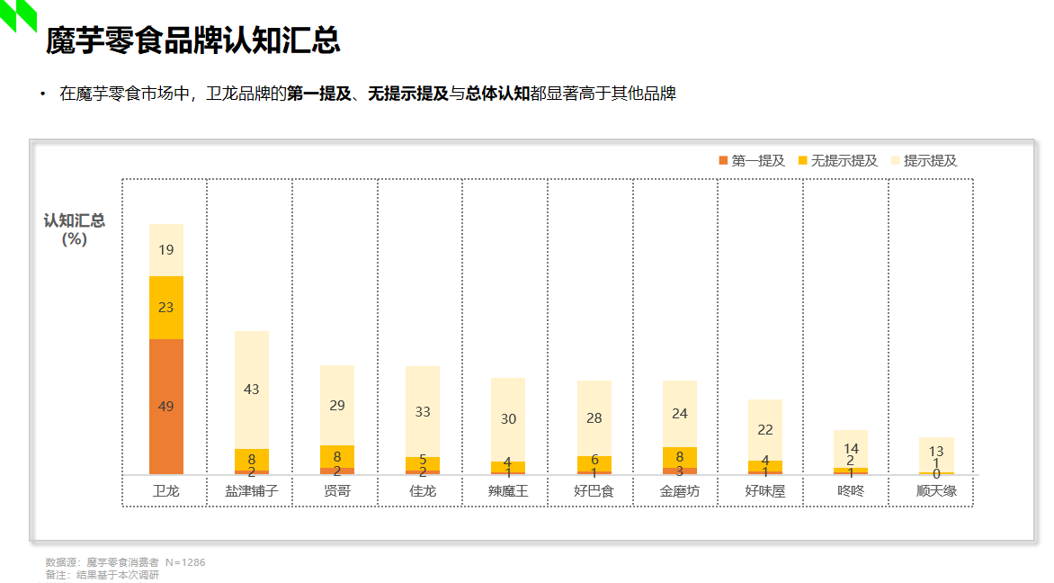 據(jù)2022年尼爾森調(diào)研顯示,在魔芋市場(chǎng)中,衛(wèi)龍品牌的第一提及、無(wú)提示提及與總體認(rèn)知都顯著高于其他品牌。顯然,衛(wèi)龍首創(chuàng)的魔芋爽在市場(chǎng)中已然奠定了良好且堅(jiān)固的受眾認(rèn)知基礎(chǔ),那么“小魔女”的加入,不僅進(jìn)一步充實(shí)了衛(wèi)龍自身的產(chǎn)品矩陣,占位了“魔芋素毛肚”的產(chǎn)品類目,也將引領(lǐng)魔芋休閑食品賽道邁向更高品質(zhì)的發(fā)展方向,為市場(chǎng)創(chuàng)造全新的增量機(jī)遇。