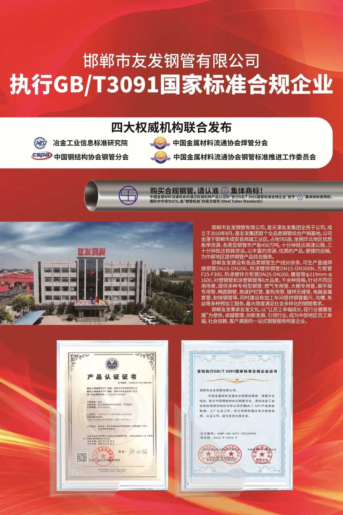 10月16日,由四大權(quán)威機(jī)構(gòu)聯(lián)合發(fā)布的首批入圍《執(zhí)行GB/T 3091國家標(biāo)準(zhǔn)合規(guī)企業(yè)名錄》的14家企業(yè)中,有5家為友發(fā)集團(tuán)旗下企業(yè)。分別為友發(fā)集團(tuán)第一分公司、唐山正元管業(yè)、邯鄲友發(fā)、陜西友發(fā)和江蘇友發(fā),涵蓋友發(fā)集團(tuán)全部鍍鋅圓管產(chǎn)品。