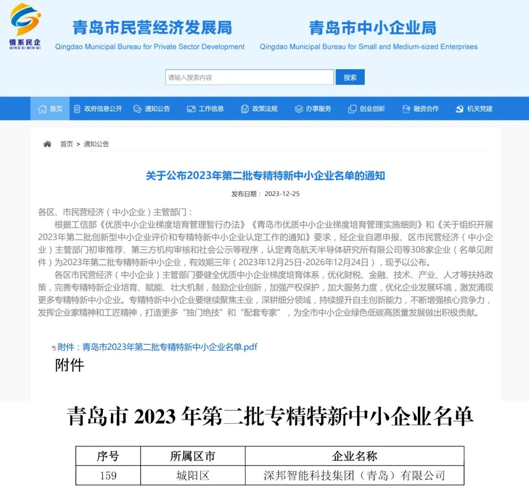 12月25日,青島市民營經濟發(fā)展局發(fā)布了《關于公示2023年第二批專精特新中小企業(yè)名單的通知》,深邦集團憑借卓越的創(chuàng)新技術、完善的產品體系、高效的運營模式以及穩(wěn)健的經營實力順利通過層層審核,獲評2023年第二批“專精特新”中小企業(yè)。
