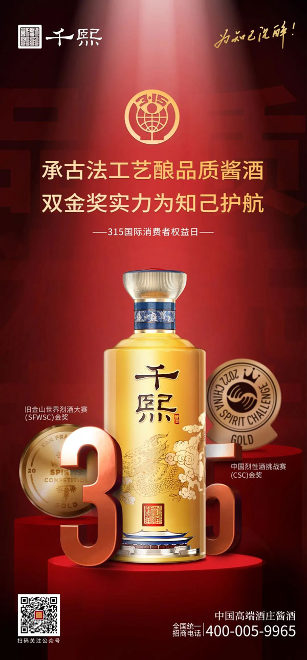 每一年的315消費(fèi)者權(quán)益日,大眾對(duì)食品安全,消費(fèi)安全總是格外敏感。作為一家以“抱樸守真 一諾千年”為品質(zhì)理念的醬酒企業(yè),從“舊金山世界烈酒大賽金獎(jiǎng)”到榮獲“CSC 中國烈性酒挑戰(zhàn)賽金獎(jiǎng)”等稱號(hào),千熙酒業(yè)始終不忘初心,以消費(fèi)者至上為宗旨,以品牌為責(zé)任,為消費(fèi)者打造品質(zhì)以恒持的一杯好酒。