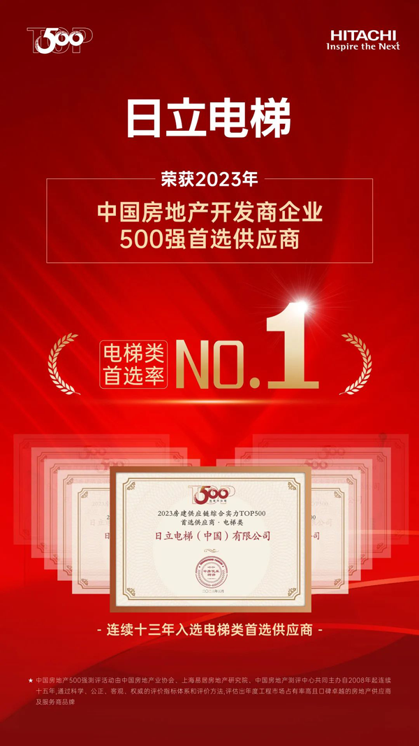 3月23日,2023房地產(chǎn)開發(fā)企業(yè)綜合實力測評成果正式發(fā)布, “2023中國房地產(chǎn)開發(fā)企業(yè)綜合實力TOP500”“TOP500房企首選供應商”等測評榜單揭曉,日立電梯以電梯品牌首選率18%,再次位居中國房地產(chǎn)Top500首選電梯類供應商榜首。