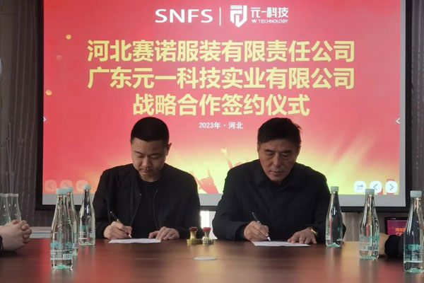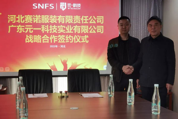 2023年2月27日,河北賽諾服裝有限責(zé)任公司同廣東元一科技實(shí)業(yè)有限公司在石家莊品匯大廈簽署了戰(zhàn)略合作協(xié)議,河北賽諾將引進(jìn)十臺價(jià)值數(shù)百萬元的自動(dòng)鋪布和自動(dòng)裁床設(shè)備,旨在通過加強(qiáng)雙方在科技方面的協(xié)作進(jìn)一步深化戰(zhàn)略伙伴關(guān)系,推動(dòng)雙方在數(shù)字化、自動(dòng)化、智能化等方面的深度合作和公司的長遠(yuǎn)發(fā)展。