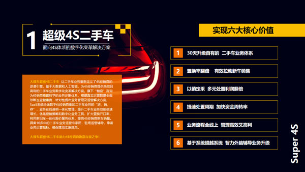 多年來(lái),268V檢測(cè)系統(tǒng)已經(jīng)在全國(guó)經(jīng)銷(xiāo)商中普及,累計(jì)檢測(cè)數(shù)百萬(wàn)車(chē)輛。如今,該系統(tǒng)進(jìn)一步融入云計(jì)算、人工智能、圖像識(shí)別、語(yǔ)音識(shí)別等先進(jìn)技術(shù),可以實(shí)現(xiàn)全程無(wú)人化和更高的檢測(cè)效率與精準(zhǔn)度。在此基礎(chǔ)上,車(chē)易拍聚合大搜車(chē)的SaaS能力和自身的交易拍賣(mài)能力,推出了超級(jí)4S二手車(chē)這一數(shù)字化變革解決方案,通過(guò)對(duì)進(jìn)、銷(xiāo)、存、管的全面數(shù)字化,有效推動(dòng)經(jīng)銷(xiāo)商內(nèi)部工作流程的規(guī)范化和提升運(yùn)營(yíng)效率。